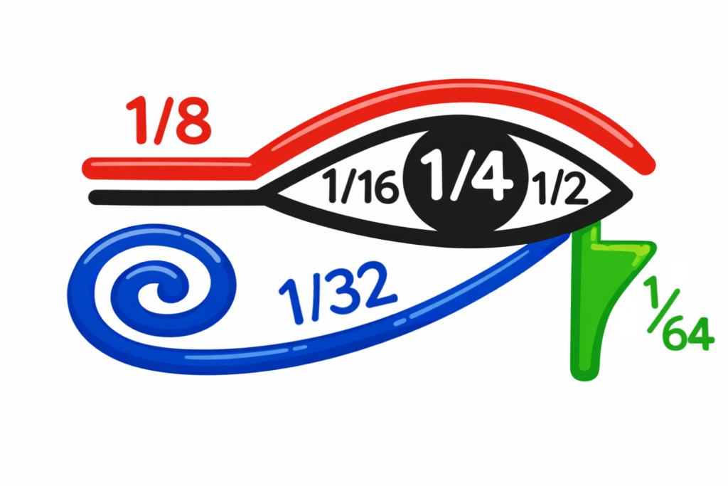 신화에 따르면, 태양신 호루스는 숙부 세트(Seth)와의 전투에서 왼쪽 눈을 잃고 눈이 64조각으로 찢기게 됩니다. 이후 지혜의 신 토트(Thoth)가 이 조각들을 모아 눈을 치유해주는데, 이때 각 조각은 수학적 의미를 지니게 됩니다.