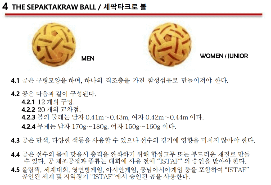 대한세팍타크로 협회 홈페이지에서 규정한 세팍타크로에 사용하는 공을 살펴보면 다음과 같습니다.