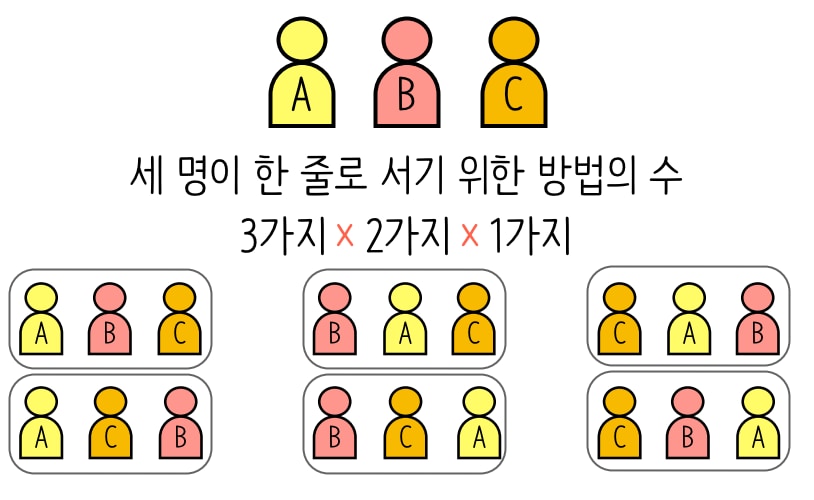 예를 들어, 3명의 아이들이 한 줄로 설 수 있는 방법의 가지 수는 3!=6가지입니다.