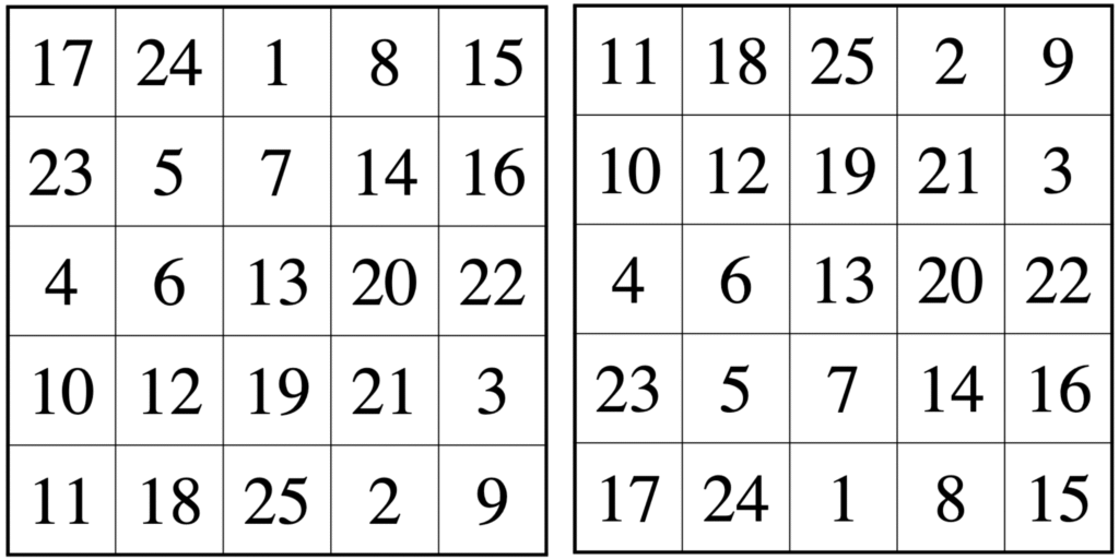 5차 마방진은 1~25까지의 수를 사용하여 가로, 세로, 대각선의 합을 모두 같게 만든 것입니다. 계산 결과에 따르면 275,305,224개(회전, 대칭 무시)가 존재한다고 해요.