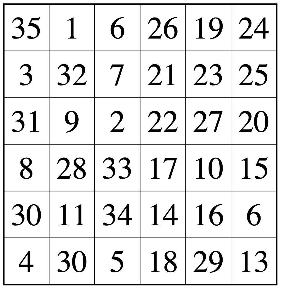 6차 마방진은 이중 짝수 차수(4의 배수가 아닌 짝수 차수)에 해당하여 만드는 방법도 조금 더 복잡한 편입니다. (만드는 방법은 존재합니다.) 6차 마방진의 개수는 현재까지도 정확하게 계산이 되지 않았다고 해요. 4차 마방진에서 5차 마방진이 되었을 때 마방진의 개수가 기하급수적으로 늘어난 것처럼, 6차, 7차 마방진의 개수는 훨씬 더 커질 것으로 예상됩니다.